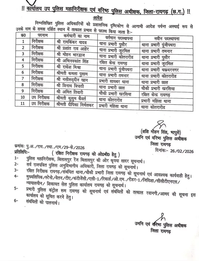 रायगढ़। जिले में पुलिस विभाग में एक बार फिर बड़े पैमाने पर तबादला किया गया है। जिले के पुलिस अधीक्षक (एसपी) ने आदेश जारी कर 11 थाना प्रभारियों का स्थानांतरण कर दिया है।