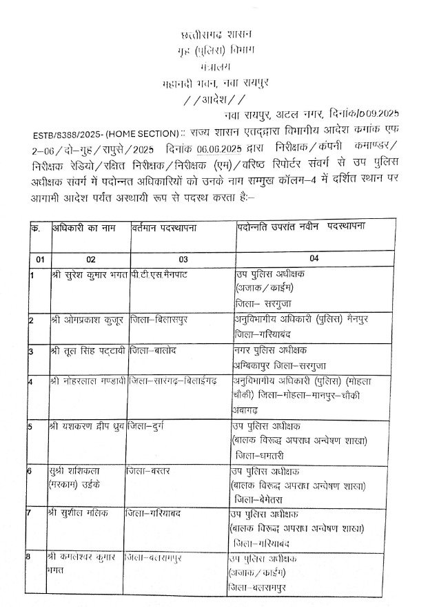 रायपुर। छत्तीसगढ़ शासन, गृह (पुलिस) विभाग द्वारा राज्य के विभिन्न जिलों में पुलिस अधिकारियों की पदस्थापना में व्यापक फेरबदल किया गया है। यह आदेश राज्य शासन द्वारा 06.06.2025 को जारी किए गए निर्देशों के आधार पर लागू किया गया है। आदेश में निरीक्षक, उप पुलिस अधीक्षक एवं अन्य पदों पर कार्यरत अधिकारियों को उनके वर्तमान पद से पदोन्नति उपरांत नई जिम्मेदारियां सौंपी गई हैं। अधिकारियों को उनके नाम, वर्तमान पदस्थापना तथा नई नियुक्ति स्थान के साथ सूचीबद्ध किया गया है।