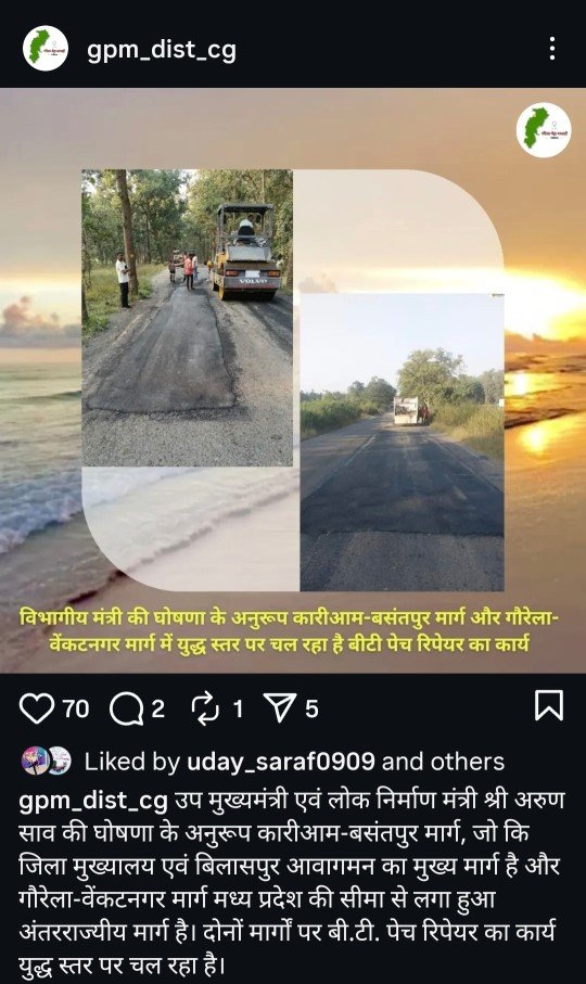 गौरेला -पेण्ड्रा – मरवाही : – जिला प्रशासन सोशल मीडिया में पोस्ट कर रहा है मंत्री जी की घोषणा के अनुसार कारिआम बसंतपुर मार्ग एवं गौरेला वेंकटनगर मार्ग में युद्ध स्तर पर बीटी पेंच रिपेयरिंग का कार्य जारी है। लेकिन सवाल यह है कि साहेब युद्ध स्तर पर काम हो रहा है या सड़कें ही युद्ध का मैदान बना दी गई हैं? इंस्टाग्राम पोस्ट में दिख रहे रोड रोलर , जेसीबी और ड्रोन-शॉट जैसी तस्वीरों ने कुछ देर के लिए माहौल बना दिया वाह! प्रशासन जाग गया! मगर जमीनी हकीकत यह है कि जहाँ एक तरफ मंत्री जी का नाम लेकर युद्ध स्तर पर रिपेयरिंग का ढोल पीटा जा रहा है,वहीं दूसरी तरफ उसी सड़क पर ताजा डाले गए पेंच उखड़कर लोगों दुकान तक पहुँच रहे है।