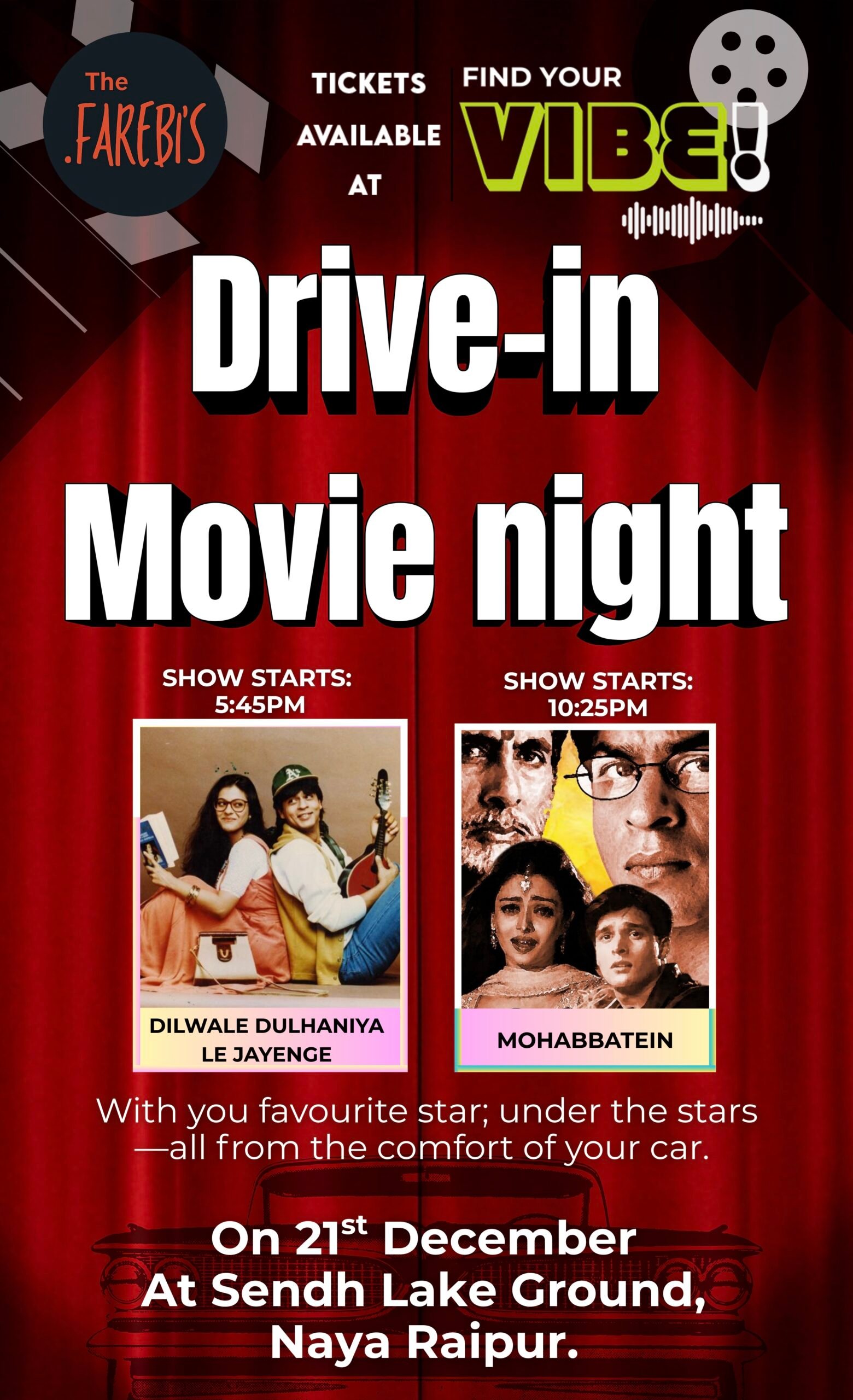 ड्राइव-इन मूवी का यह आयोजन एमएसएमई “द फ़रेबिस” द्वारा किया जा रहा है। पहले दिन दर्शकों को बॉलीवुड की दो यादगार फिल्मों का आनंद मिलेगा। शाम 5.45 बजे अपने रिलीज़ के 30 वर्ष पूरे कर चुकी सुपरहिट फिल्म ‘दिलवाले दुल्हनिया ले जाएंगे’ दिखाई जाएगी, जबकि रात 10.25 बजे सिल्वर जुबली ईयर मना रही फिल्म ‘मोहब्बतें’ का टेलीकास्ट होगा।