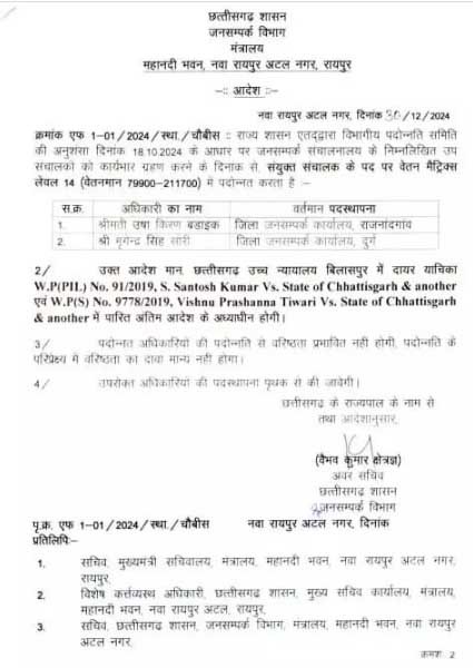 रायपुर। प्रदेश के जनसंपर्क विभाग के दो सहायक संचालकों को उप संचालक के पद पर पदोन्नत किया गया हैं। वही दो उप संचालकों को संयुक्त संचालक बनाया गया है। उषा किरण और मृगेंद्र सिंह सोरी को उप संचालक से संयुक्त संचालक और आनंद प्रकाश सोलंकी और शशि रत्न परासर जो सहायक संचालक थे उन्हें उप संचालक के पद पर पदोन्नति किया गया है।